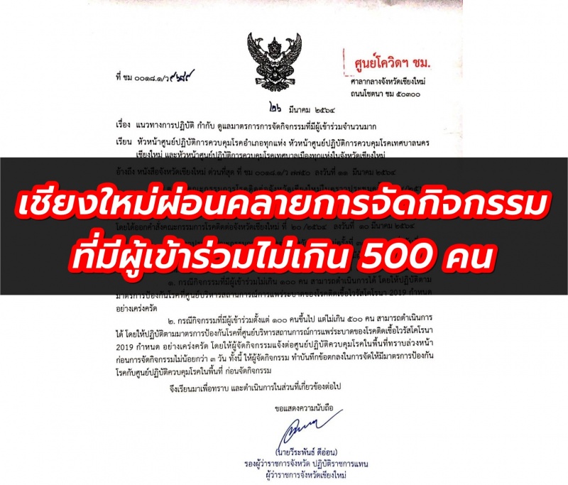 | • จังหวัดเชียงใหม่ผ่อนคลายมาตรการในการจัดกิจกรรมที่มีผู้เข้าร่วมไม่เกิน 500 คน |
