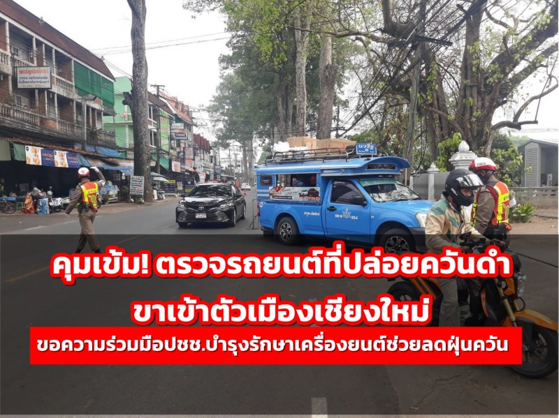 จังหวัดเชียงใหม่ คุมเข้มตรวจสอบรถยนต์ที่ปล่อยควันดำขาเข้าตัวเมืองเชียงใหม่ พร้อมขอความร่วมมือประชาชนบำรุงรักษาและซ่อมแซมเครื่องยนต์ให้อยู่ในสภาพปกติ เพื่อช่วยลดปัญหาหมอกควัน