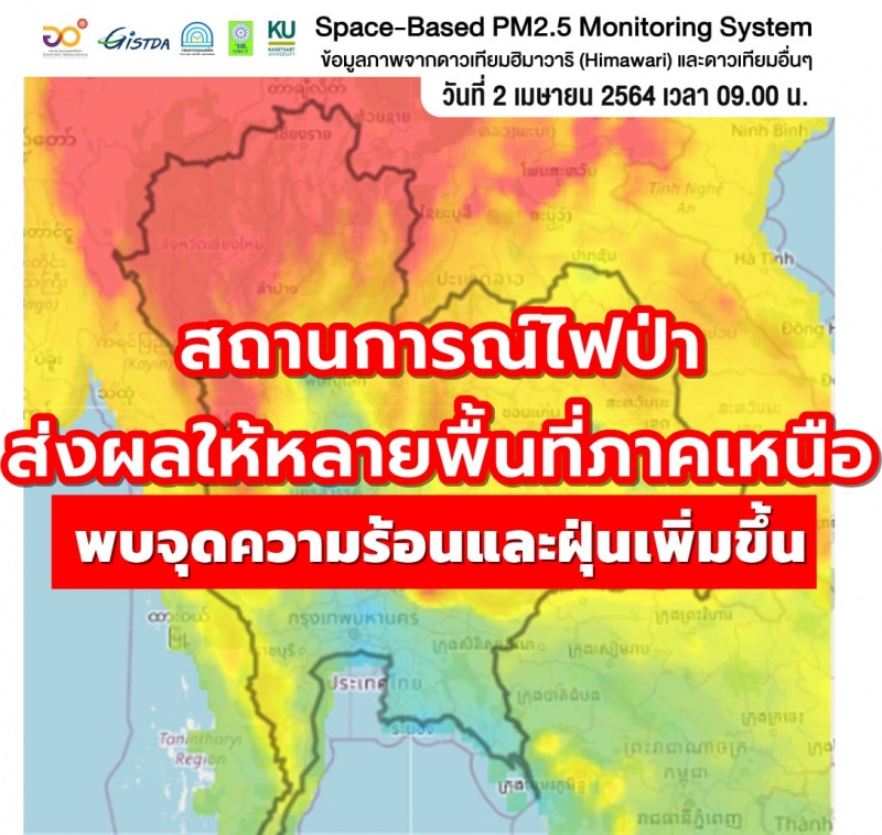 GISTDA เฝ้าติดตามสถานการณ์ PM 2.5 อย่างต่อเนื่อง เช้านี้พบว่า ข้อมูลภาพจากดาวเทียมฮิมาวาริ (Himawari) และดาวเทียมอื่นๆ ของระบบการติดตามปริมาณฝุ่นละอองขนาดเล็ก (PM2.5) ของวันที่ 2 เมษายน 2564 ในเช้านี้ช่วงเวลา 09.00 น. พบพื้นที่ภาคเหนือยังคงปกคลุมไปด้วยฝุ่นละออง PM 2.5 ในระดับที่มีผลกระทบต่อสุขภาพ (สีแดง) และพบบางพื้นที่อยู่ในระดับเริ่มมีผลกระทบต่อสุขภาพ (สีส้ม) โดยเฉพาะพื้นที่จังหวัด  เชียงราย พบค่า AQI สูงถึง 313 และต่ำสุดในภาคเหนืออยู่ที่ เพชรบูรณ์ พบค่า AQI 49