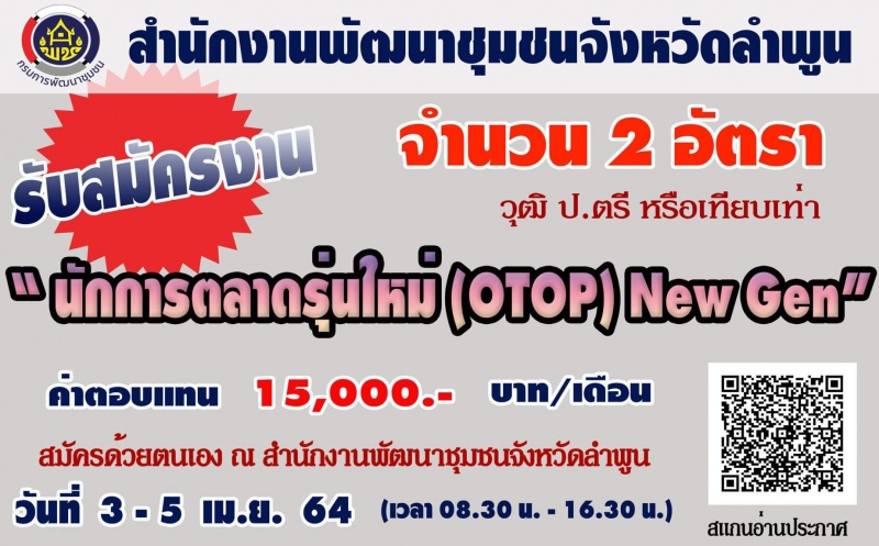พช.ลำพูน รับสมัครนักการตลาดรุ่นใหม่ (OTOP) New Gen จำนวน 2 อัตรา