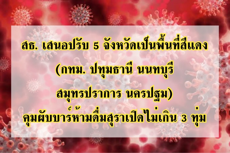 | • สธ. เสนอปรับ 5 จังหวัดเป็นพื้นที่สีแดง (กทม. ปทุมธานี นนทบุรี สมุทรปราการ นครปฐม) คุมผับบาร์ห้ามดื่มสุราเปิดไม่เกิน 3 ทุ่ม |
