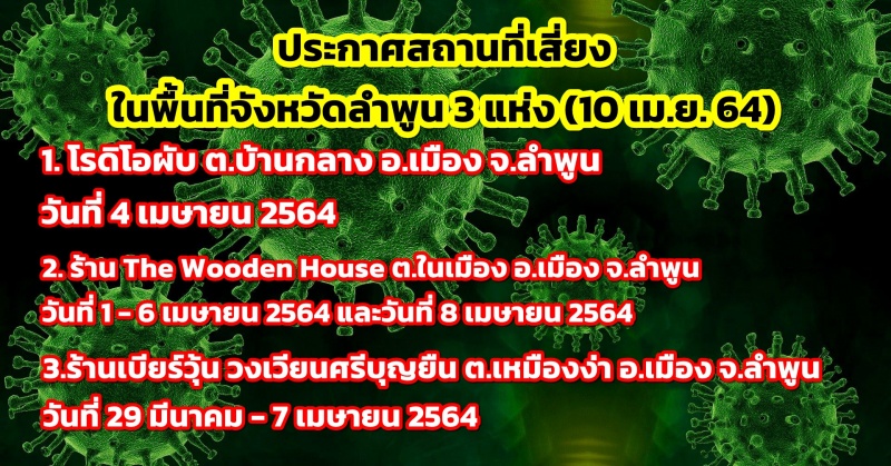 | • สสจ.ลำพูน ประกาศสถานที่เสี่ยง ในพื้นที่จังหวัดลำพูน 3 แห่ง (10 เม.ย. 64) |