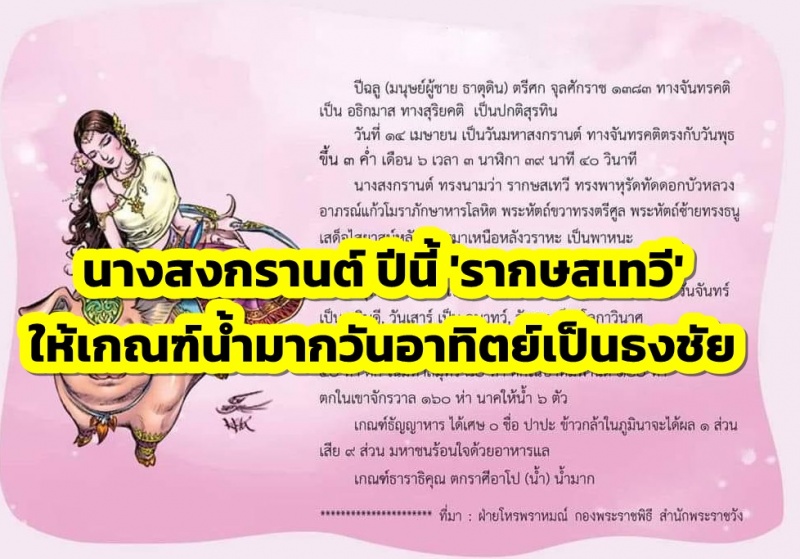 นางสงกรานต์ ปีนี้ 'รากษสเทวี' ให้เกณฑ์น้ำมาก วันอาทิตย์เป็นธงชัย
