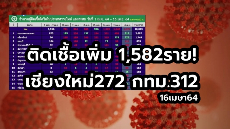 | • สธ.รายงาน ติดเชื้อเพิ่ม 1,582ราย! ครบทุกจังหวัด (เชียงใหม่272 กทม.312) |