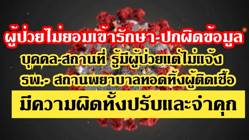 | • ใช้ กม.จัดการ !! รพ.- สถานพยาบาลทอดทิ้งผู้ติดเชื้อ บุคคล-สถานที่ รู้มีผู้ป่วยแต่ไม่แจ้ง กระทั่ง ผู้ป่วยไม่ยอมเข้ามารักษา-ปกผิดข้อมูล ถือเป็นความผิดทุกกรณี ทั้งปรับและจำคุก |