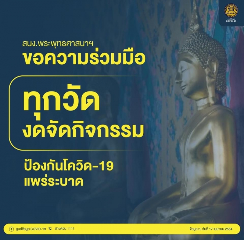 สำนักงานพระพุทธศาสนาแห่งชาติ ออกหนังสือถึงเจ้าคณะจังหวัดทุกจังหวัดทั่วประเทศ ขอความร่วมมืองดจัดกิจกรรมทุกชนิด ที่อาจก่อให้เกิดการแพร่ระบาดของโควิด 19 ได้ อีกทั้งให้ปฏิบัติตามมาตรการป้องกันโรคคัดกรองอย่างเคร่งครัด