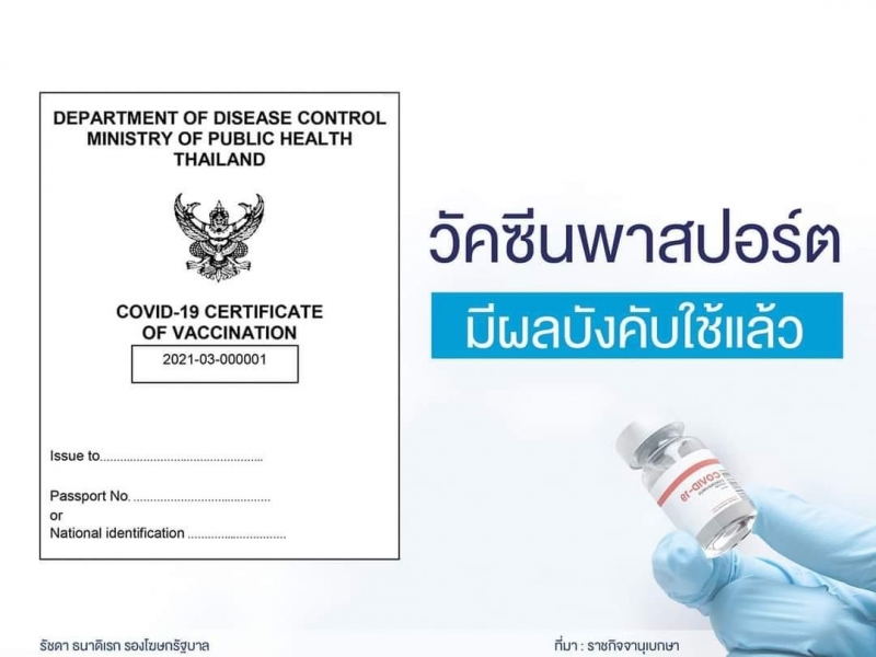 วัคซีนพาสปอร์ต (Vaccine Passport) มีผลบังคับใช้แล้ว โดยกรมควบคุมโรค กระทรวงสาธารณสุข เป็นผู้จัดทำวัคซีนพาสปอร์ต ซึ่งเป็นหนังสือรับรองบุคคลที่ได้รับวัคซีนป้องกันโรคโควิด-19 ระบุชื่อ และข้อมูลส่วนบุคคล เป็นภาษาอังกฤษ เพื่อใช้เดินทางต่างประเทศ