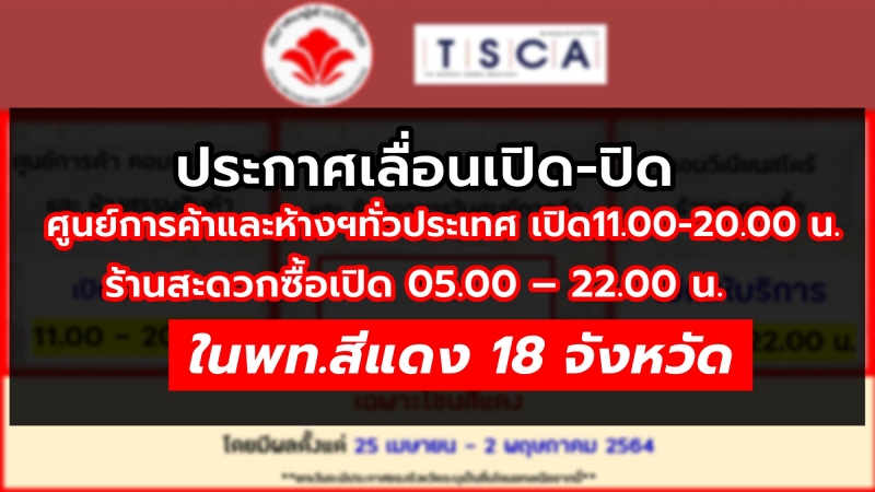 ประกาศเลื่อนเปิด-ปิดศูนย์การค้าและห้างฯทั่วประเทศ เป็นเวลา 11.00- 20.00 น. ร้านสะดวกซื้อเปิด 05.00 – 22.00 น. ในพท.สีแดง 18 จังหวัด