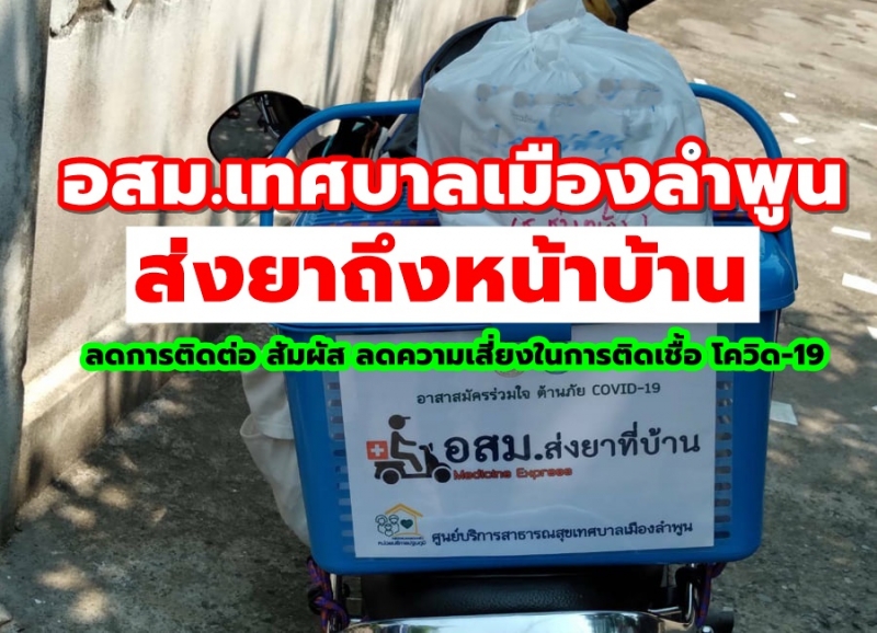 ศูนย์บริการสาธารณสุขเทศบาลเมืองลำพูน ร่วมกับ อสม.เทศบาลเมืองลำพูน ดำเนินโครงการส่งยาให้ผู้ป่วยโรคเรื้อรังถึงที่บ้าน โดยที่ผู้ป่วยไม่ต้องออกจากบ้านเพื่อลดการติดต่อ สัมผัส ลดความเสี่ยงในการติดเชื้อ โควิด-19