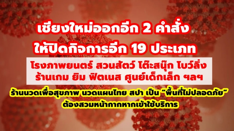 เชียงใหม่ออกอีก 2 คำสั่ง ให้ปิดกิจการอีก 19 ประเภท โรงภาพยนตร์ สวนสัตว์ โต๊ะสนุ๊ก โบว์ลิ่ง ร้านเกม ยิม ฟิตเนส ศูนย์เด็กเล็ก ฯลฯ พร้อมให้นิยามเพิ่มให้ ร้านนวดเพื่อสุขภาพ นวดแผนไทย สปา เป็น “พื้นที่ไม่ปลอดภัย” ต้องสวมหน้ากากหากเข้าใช้บริการ