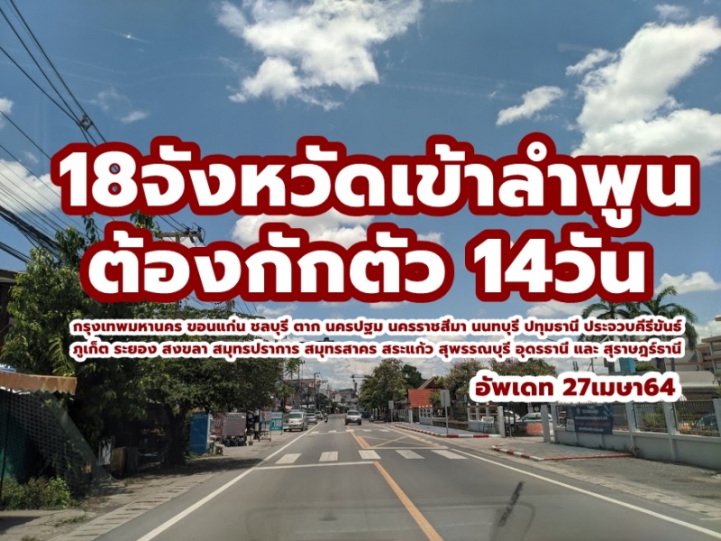 27 เมษา64 ลำพูนออกคำสั่ง ให้ผู้ที่เดินทางเข้ามาในพื้นที่จังหวัดลำพูน โดยกำหนดให้ผู้ที่เดินทางมาจาก หรือกลับมาจาก หรือร่วมเดินทางมาจากพื้นที่ กรุงเทพมหานคร จังหวัดขอนแก่น จังหวัดชลบุรี จังหวัดตาก จังหวัดนครปฐม จังหวัดนครราชสีมา จังหวัดนนทบุรี จังหวัดปทุมธานี จังหวัดประจวบคีรีขันธ์ จังหวัดภูเก็ต จังหวัดระยอง จังหวัดสงขลา จังหวัดสมุทรปราการ จังหวัดสมุทรสาคร จังหวัดสระแก้ว จังหวัดสุพรรณบุรี และจังหวัดอุดรธานี และกำหนดให้ผู้ที่พำนักอยู่ในจังหวัดลำพูนที่เดินทางไปพื้นที่ดังกล่าว ให้รายงานตัวกับ เจ้าหน้าที่ และ กักตัว 14วัน