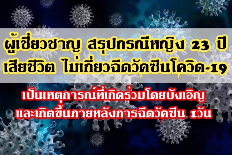 ผู้เชี่ยวชาญ สรุปกรณีหญิง 23 ปี เสียชีวิต ไม่เกี่ยวฉีดวัคซีนโควิด-19 เป็นเหตุการณ์ที่เกิดร่วมโดยบังเอิญ และเกิดขึ้นภายหลังการฉีดวัคซีน 1 วัน