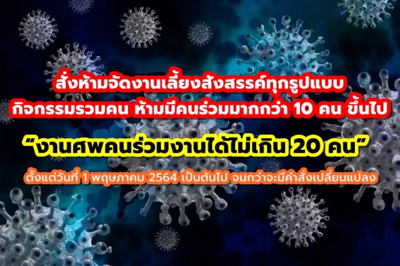 | • สั่งห้ามจัดงานเลี้ยงสังสรรค์ทุกรูปแบบ กิจกรรมรวมคน ห้ามมีคนร่วมมากกว่า 10 คน ขึ้นไป งานศพคนร่วมงานได้ไม่เกิน 20 คน |
