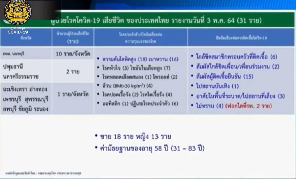 สำหรับรายละเอียดผู้เสียชีวิต 31 ราย เป็นเพศชาย 18 ราย เพศหญิง 13 ราย อายุระหว่าง 31 - 83 ปี