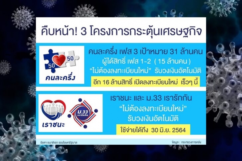 ความคืบหน้า 3 โครงการกระตุ้นเศรษฐกิจ คนละครึ่งเฟส3 เราชนะ และ ม.33 เรารักกัน