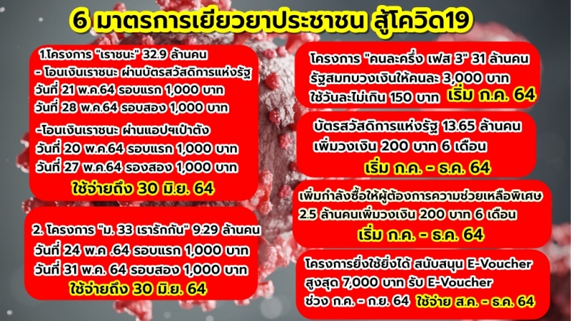 1.โครงการ "เราชนะ" 32.9 ล้านคน เพิ่มวงเงิน 2,000 บาท สัปดาห์ละ 1,000 บาท 2 สัปดาห์ ใช้จ่ายถึง 30 มิ.ย. 64