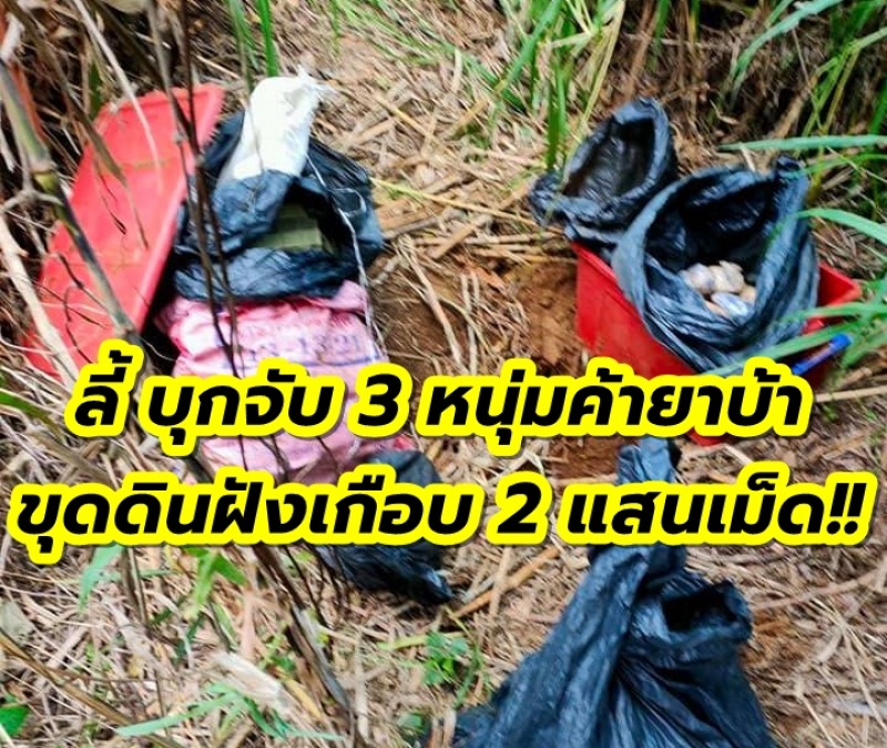 ฝ่ายความมั่นคงอำเภอลี้ บุกจับ 3 หนุ่มค้ายาบ้า ขุดดินฝังกลบยาบ้าซุกซ่อนไว้ในถังพลาสติก เพื่อพรางตาเจ้าหน้าที่ จำนวน 91 มัด นับรวมได้เกือบ 2 แสนเม็ด