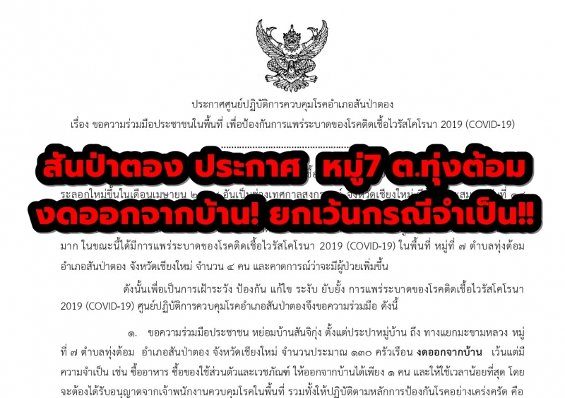ประกาศอำเภอสันป่าตอง จังหวัดเชียงใหม่ พื้นที่ควบคุมเข้มงวด(หมู่ 7 ต.ทุ่งต้อม อ.สันป่าตอง จ.เชียงใหม่ งดออกจากบ้าน ยกเว้นกรณีจำเป็น)