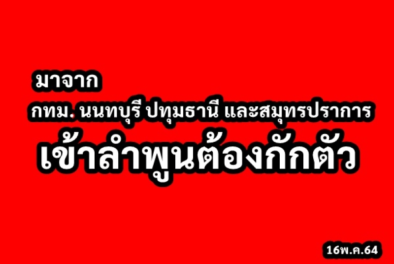 | • ลำพูนประกาศ! มาจาก กทม. นนทบุรี ปทุมธานี และสมุทรปราการ ต้องกักตัว14วัน!! |