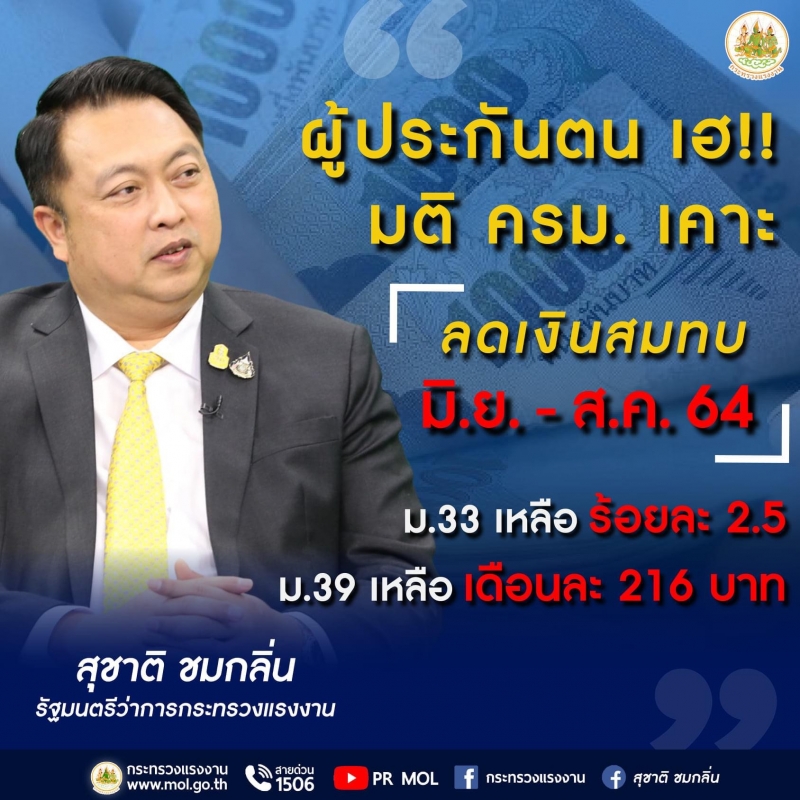 ผู้ประกันตน เฮ!! ครม.เห็นชอบลดเงินสมทบ เหลือร้อยละ 2.5ตั้งแต่ มิ.ย. – ส.ค. 64
