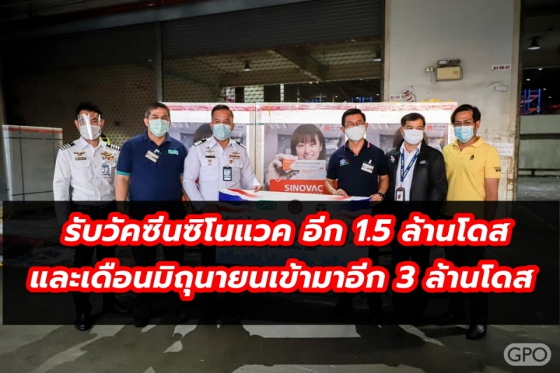 องค์การเภสัชกรรม(GPO) รับวัคซีนซิโนแวค อีก 1.5 ล้านโดส และเดือนมิถุนายนเข้ามาอีก 3 ล้านโดส