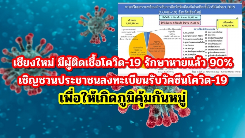 เชียงใหม่ มีผู้ติดเชื้อโควิด-19 รักษาหายแล้ว 90% เชิญชวนประชาชนลงทะเบียนรับวัคซีนโควิด-19 เพื่อให้เกิดภูมิคุ้มกันหมู่