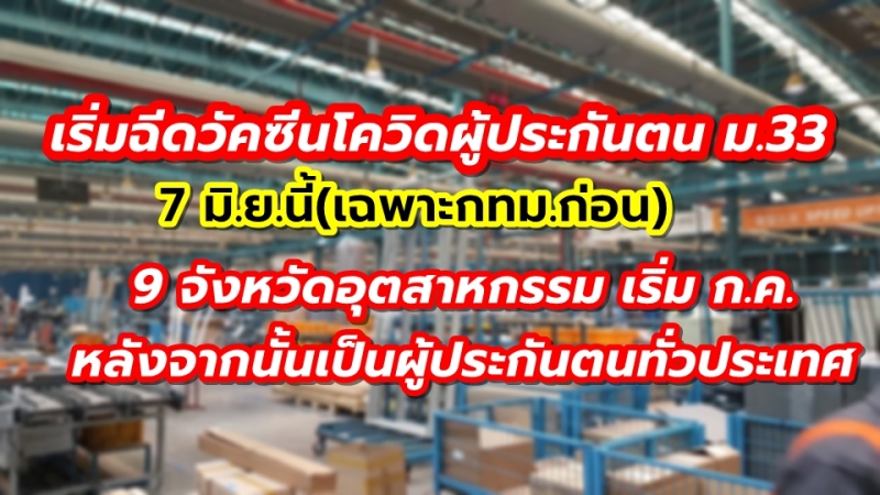 กระทรวงแรงงาน เริ่มฉีดวัคซีนโควิดผู้ประกันตน ม.33 7 มิ.ย.นี้ เฉพาะ กทม.ก่อน ส่วน 9 จังหวัดอุตสาหกรรม เริ่ม ก.ค. หลังจากนั้นเป็นผู้ประกันตนทั่วประเทศ