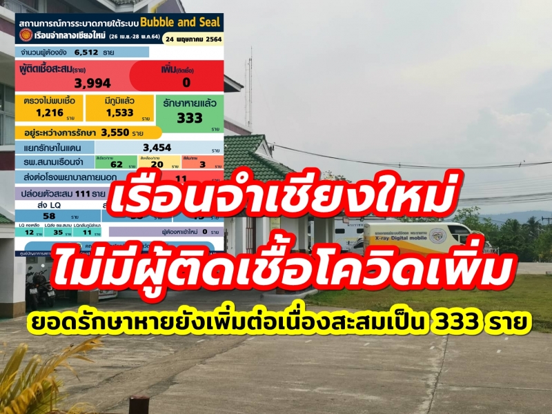 เรือนจำเชียงใหม่ไม่มีผู้ติดเชื้อโควิดเพิ่ม ยอดรักษาหายยังเพิ่มต่อเนื่องสะสมเป็น 333 ราย ยังมีผู้ที่อยู่ระหว่างการรักษา 3,454 ราย