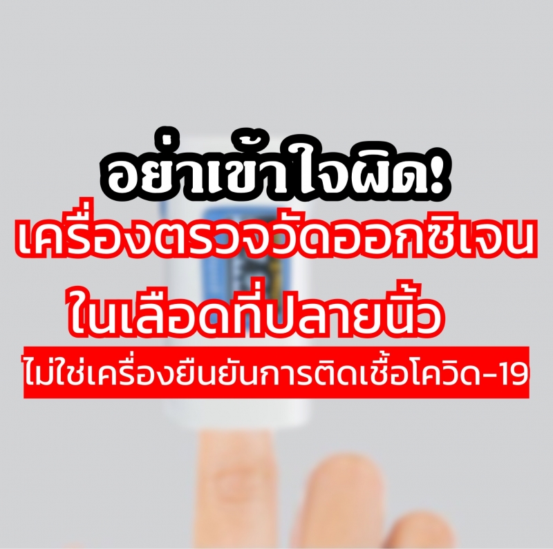 อย. ขอเรียนว่า เครื่องตรวจวัดระดับออกซิเจนในเลือดที่ปลายนิ้วไม่ใช่เครื่องมือที่ใช้ในการวินิจฉัยยืนยันการติดเชื้อโควิด-19 แต่ใช้ตรวจวัดระดับออกซิเจนในเลือดและอัตราการเต้นของหัวใจ เพื่อประเมินสภาวะผิดปกติของร่างกายหรือติดตามอาการของผู้ป่วย
