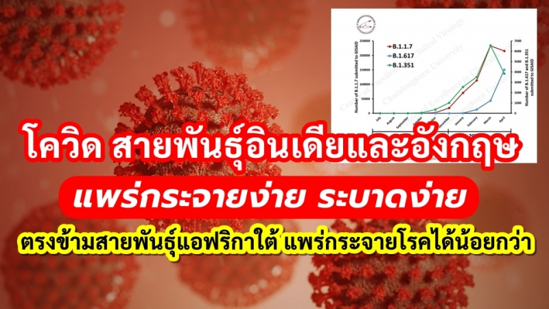 | • หมอยง เผยสายพันธุ์อินเดีย และอังกฤษ แพร่กระจายง่าย ระบาดง่าย ตรงข้ามสายพันธุ์แอฟริกาใต้ แพร่กระจายโรคได้น้อยกว่า |