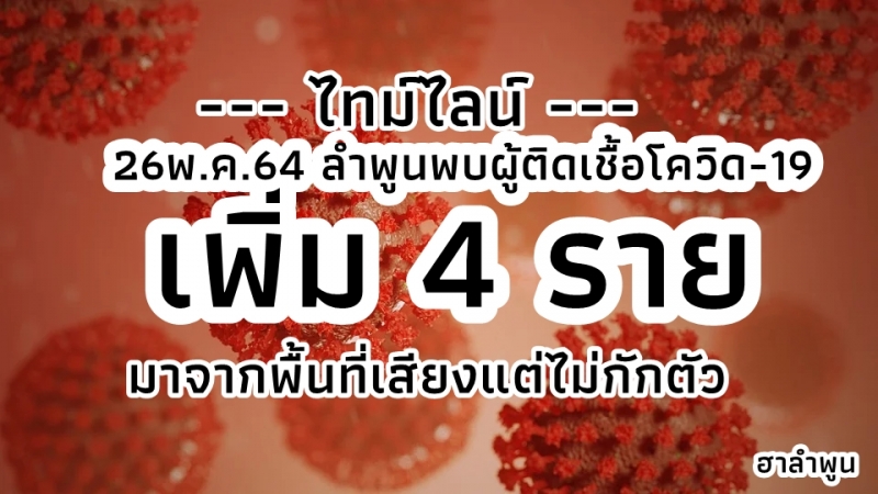 26 พ.ค.64 จ.ลำพูน หลังจาก ไม่พบผู้ติดเชื้อมาแล้ว 12วัน วันนี้ พบผู้ติตเชื้อโควิด เพิ่ม 4ราย โดยส่วนใหญ่เกิดจาก มาจากพื้นที่เสี่ยง แล้วไม่กักตัว