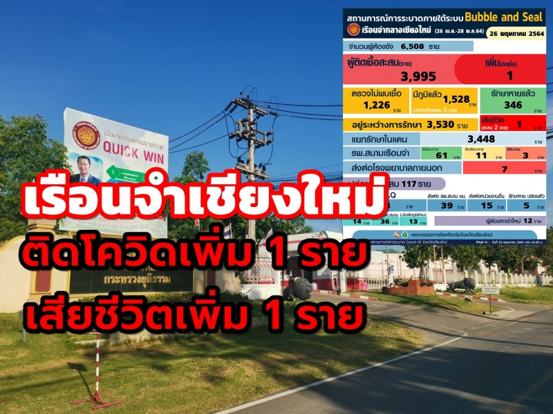 วันที่ 26 พ.ค. 64 ศูนย์ข้อมูลข่าวสารเฉพาะกิจจังหวัดเชียงใหม่ รายงานข้อมูลสถานการณ์การระบาดภายใต้ระบบ Bubble and Seal เรือนจำกลางเชียงใหม่ (26 เม.ย.- 28 พ.ค. 64) ว่า วันนี้เรือนจำกลางเชียงใหม่พบมีผู้ต้องขังติดเชื้อไวรัสโคโรน่า 2019 หรือ โควิด-19 เพิ่มอีก 1 ราย ทำให้ยอดผู้ติดเชื้อสะสมเป็น 3,995 ราย มีผู้รักษาเพิ่มอีก 13 ราย ยอดผู้รักษาหายแล้วเพิ่มเป็น 346 ราย และยอดผู้ตรวจไม่พบเชื้อสะสมรวม 1,226 ราย วันนี้มีผู้ต้องขังเสียชีวิตเพิ่มอีก 1 ราย รวมมียอดผู้เสียชีวิตสะสม 2 ราย