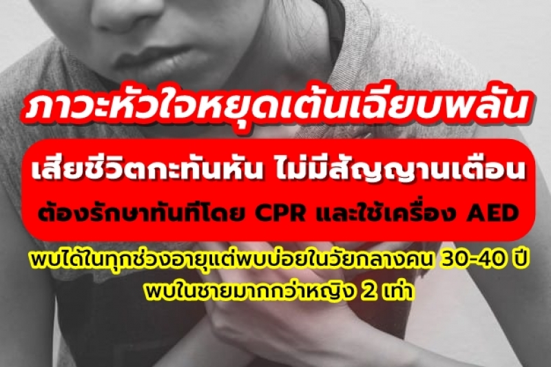 กรมการแพทย์ โดยสถาบันโรคทรวงอก แนะนำภาวะหัวใจหยุดเต้นเฉียบพลัน (Sudden Cardiac Arrest) ทำให้เสียชีวิตกะทันหันโดยปราศจากสัญญาณเตือน ต้องรักษาทันที โดยการทำ CPR และใช้เครื่อง AED