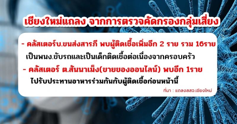 ส่วนการตรวจคัดกรองเชิงรุกในพื้นที่เสี่ยง เมื่อวานนี้มีสำนักงานสาธารณสุขจังหวัดเชียงใหม่ ได้ทำการตรวจคัดกรองเชิงรุกในแคมป์แรงงานต่างด้าว ตำบลแม่เหียะ 3 แห่ง จำนวน 91 ราย ผลเป็นลบทั้งหมด และได้ลงตรวจที่บริษัทฤทธา ประเสริฐแลนด์ ตรวจไปทั้งหมด 204 ราย ซึ่งผลจะแจ้งให้ทราบต่อไป ทั้งนี้ได้รับความร่วมมืออย่างดีจากบริษัทดังกล่าว ในการอำนวยความสะดวก จัดพนักงานเข้ามาตรวจคัดกรอง สำหรับการตรวจคัดกรองพนักงานขับรถ ที่ได้เดินทางไปส่งของต่างจังหวัดหรือพื้นที่เสี่ยง ซึ่งเป็นผู้ป่วยโควิดที่รักษาหายแล้ว สามารถใช้ใบรับรองแพทย์ได้ โดยไม่ต้องมาตรวจซ้ำทุก 7 วัน ในส่วนของคลัสเตอร์ทั้ง 21 คลัสเตอร์ของจังหวัดเชียงใหม่ วันนี้ไม่พบคลัสเตอร์ใหม่ ขณะนี้ปลอดภัยแล้ว 7 คลัสเตอร์ และมีคลัสเตอร์ที่ต้องเฝ้าระวังใกล้ชิดอีก 2 คลัสเตอร์ โดยเฉพาะคลัสเตอร์บริษัทขนส่งที่อำเภอสารภี จากการตรวจคัดกรองกลุ่มเสี่ยงในพื้นที่ พบผู้ติดเชื้อเพิ่ม 2 ราย รวมเป็น 16 ราย โดย 2 ราย เป็นพนักงานขับรถ 1 ราย และติดเชื้อต่อเนื่องในครอบครัวอีก 1 ราย อีกหนึ่งคลัสเตอร์คือ ตำบลสันนาเม็ง วันนี้พบผู้ติดเชื้อเพิ่มอีก 1 ราย เป็นการติดเชื้อต่อเนื่องกันมาเป็นวงรอบที่ 4 ซึ่งติดจากการไปรับประทานอาหารร่วมกัน