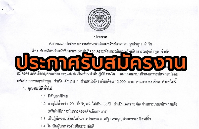ทรัพย์สาธารณสุขลำพูน จำกัด จำนวน 1 ตำแหน่งอัตราเงินเดือน 12,000 บาท ตามรายละเอียด ดังต่อไปนี้
