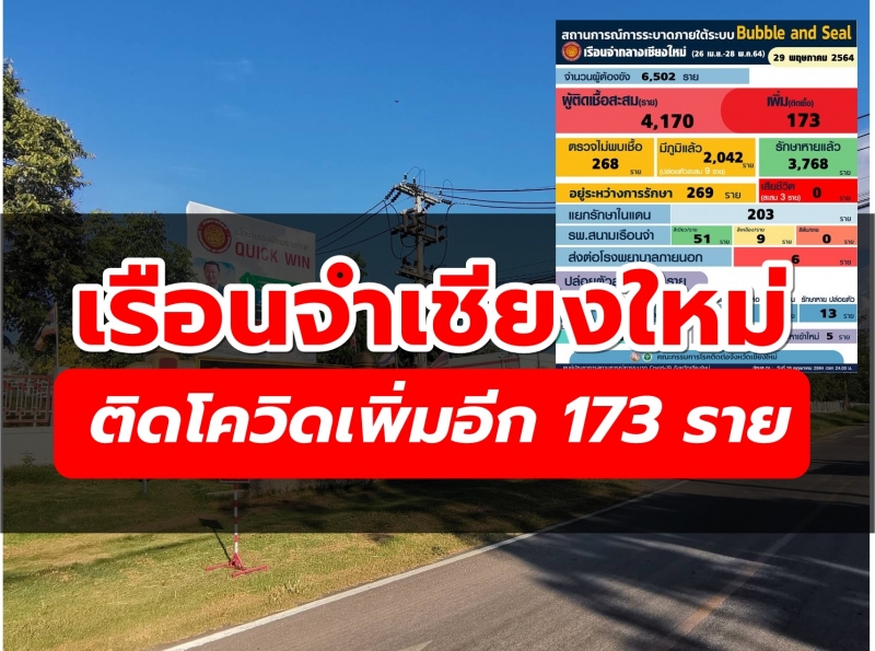 ติดโควิด-19 เรือนจำเชียงใหม่ ติดเพิ่มอีก 173 ราย จากการตรวจรอบ 2 ตาม Exit plan ของมาตรการ Bubble & Sealed รักษาหายเพิ่มอีก 8 ราย ผู้ถูกกักใน LQ กลับบ้านได้อีก 8 ราย พร้อมปิด LQ ใน บช.ตชด.กฝ.5