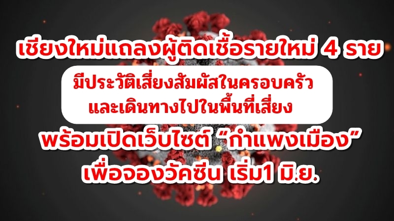 เชียงใหม่แถลงผู้ติดเชื้อรายใหม่ 4 ราย มีประวัติเสี่ยงสัมผัสในครอบครัวและเดินทางไปในพื้นที่เสี่ยง พร้อมเปิดเว็บไซต์ “กำแพงเมือง”เพื่อจองวัคซีน เริ่ม1 มิ.ย.