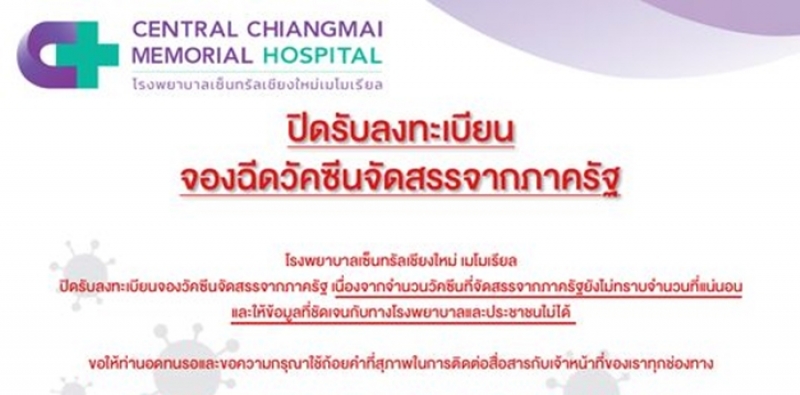 โรงพยาบาลเซ็นทรัลเชียงใหม่ เมโมเรียล ปิดรับลงทะเบียนจองวัคซีนจัดสรรจากภาครัฐ เนื่องจากจำนวนวัคซีนที่จัดสรรจากภาครัฐยังไม่ทราบจำนวนที่แน่นอน และให้ข้อมูลที่ชัดเจนกับทางโรงพยาบาลและประชาชนไม่ได้