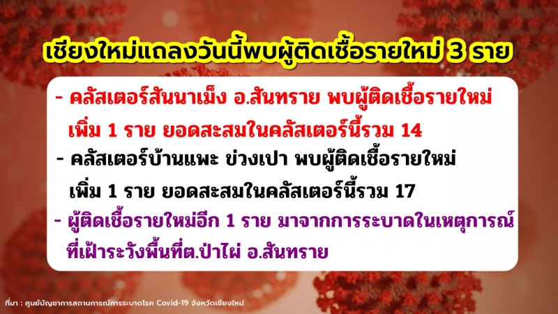 เชียงใหม่แถลงวันนี้พบผู้ติดเชื้อรายใหม่เพียง 3 ราย ดังนี้ คลัสเตอร์สันนาเม็ง อ.สันทราย พบผู้ติดเชื้อรายใหม่เพิ่ม 1 ราย ยอดสะสมในคลัสเตอร์นี้รวม 14 รายคลัสเตอร์บ้านแพะ ข่วงเปา พบผู้ติดเชื้อรายใหม่ 1 ราย ยอดสะสมในคลัสเตอร์นี้รวม 17 รายผู้ติดเชื้อรายใหม่อีก 1 ราย มาจากการระบาดในเหตุการณ์ที่เฝ้าระวังพื้นที่ต.ป่าไผ่ อ.สันทราย