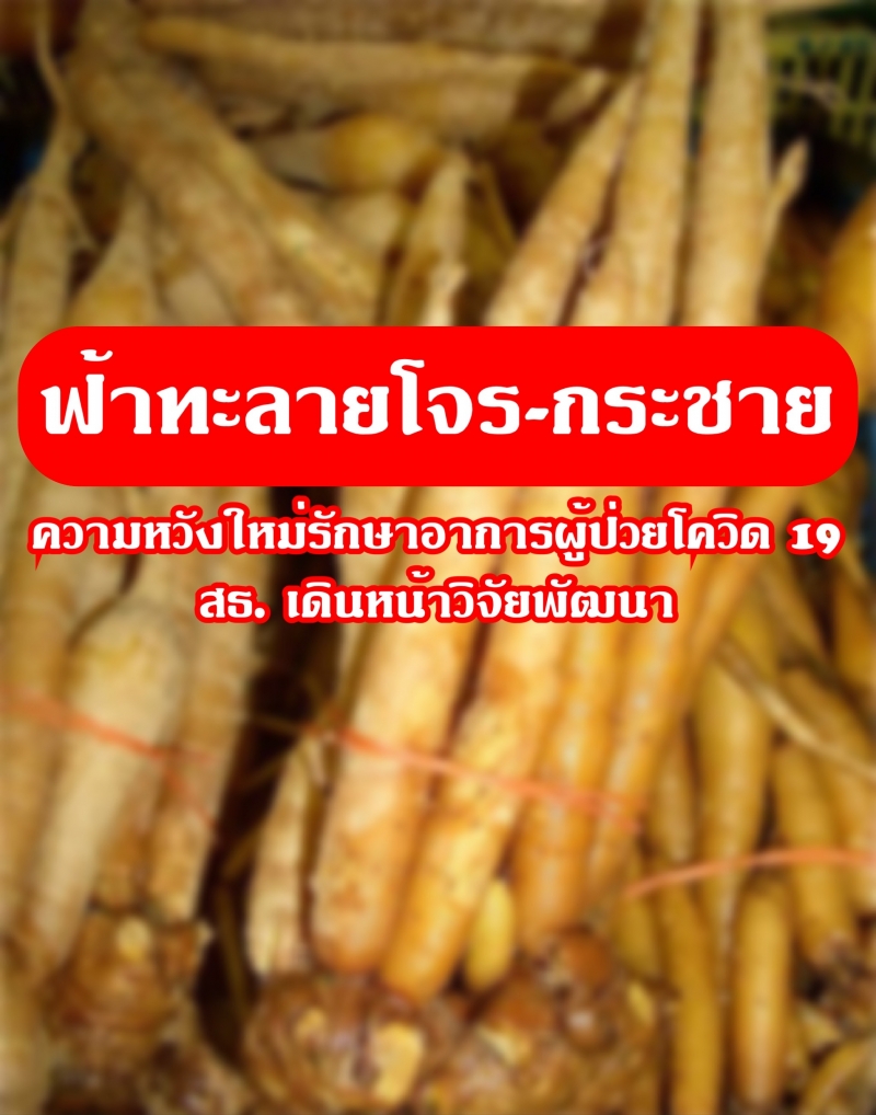 กระทรวงสาธารณสุข ร่วมกับภาคีเครือข่าย เดินหน้าต่อยอดงานวิจัยใช้สมุนไพรไทย “ฟ้าทะลายโจรและกระชาย“ รักษาอาการโรคโควิด 19 โดยกรมการแพทย์แผนไทยและการแพทย์ทางเลือก ได้ศึกษาวิจัยสมุนไพรไทยเพื่อใช้เป็นยาทางเลือกในการรักษาผู้ป่วยโควิด-19 พบว่า ฟ้าทะลายโจร มีผลยับยั้งเชื้อไวรัส และมีฤทธิ์ต้านการเพิ่มจำนวนของเชื้อไวรัส หากนำมาใช้ร่วมรักษากับการแพทย์แผนปัจจุบันในผู้ป่วยโควิด19 ที่มีระดับความรุนแรงน้อย (ไม่มีภาวะปอดอักเสบ) ผู้ป่วยส่วนใหญ่มีอาการดีขึ้นตามลำดับ และแทบไม่พบผลข้างเคียงอีกด้วย