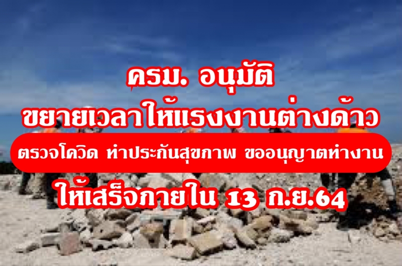 | • ครม. อนุมัติขยายเวลาให้แรงงานต่างด้าว ตรวจโควิด ทำประกันสุขภาพ ขออนุญาตทำงาน ให้เสร็จภายใน 13 ก.ย.64 |