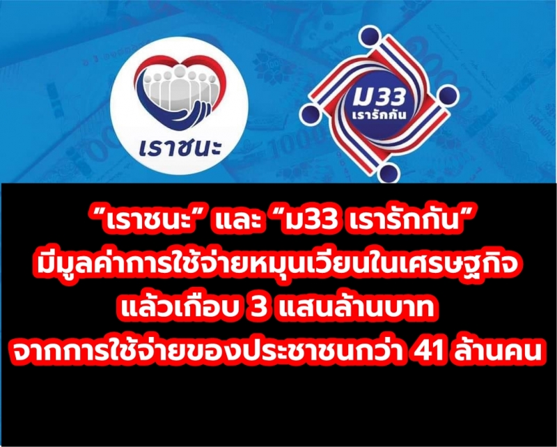 โครงการ ”เราชนะ” และ “ม33 เรารักกัน” มีมูลค่าการใช้จ่ายหมุนเวียนในเศรษฐกิจแล้วเกือบ 3 แสนล้านบาท จากการใช้จ่ายของประชาชนกว่า 41 ล้านคน