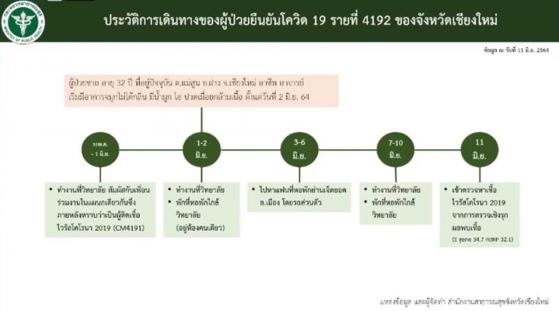 ผู้ติดเชื้อรายใหม่ทั้ง 6 รายวันนี้ 2 รายแรก เป็นการติดเชื้อในสถานที่ทำงานจากที่พบเมื่อวานนี้ โดยเป็นผู้ป่วยชายไทยทั้ง 2 คน ทำงานที่วิทยาลัยเดียวกัน เริ่มมีอาการและเข้ารับการตรวจจากการค้นหากลุ่มเสี่ยงสูง โดยตรวจไปทั้งหมด 224 ราย เสี่ยงสูง 44 ราย ผลเป็นบวก 2 ราย ผลเป็นลบ 33 ราย และอยู่ระหว่างรอผลอีก 9 ราย เสี่ยงต่ำ 180 ราย ผลเป็นลบ 179 ราย และอยู่ระหว่างรอผล 1 ราย รายที่ 3 เป็นเด็กอายุ 6 เดือน อยู่ในพื้นที่อำเภอแม่แตง พ่อแม่พาไปร่วมงานแต่งงาน ก่อนเข้ารับการผ่าตัดไส้เลื่อน ก่อนผ่าตัดแพทย์ได้ทำการตรวจหาเชื้อตามมาตรฐาน จึงตรวจพบเชื้อ อยู่ระหว่างการสอบสวน พบผู้สัมผัสเสี่ยงสูง 7 ราย ผลเป็นลบ 1 ราย และรอผลตรวจอีก 6 ราย ยังไม่มีผู้สัมผัสเสี่ยงต่ำ ส่วนผู้ติดเชื้อ 3 รายสุดท้าย นำเข้ามาจากต่างจังหวัด 2 รายแรกทำงานในห้องเย็นที่จังหวัดปทุมธานี เดินทางกลับด้วยรถยนต์ส่วนตัว ไม่ได้สแกน CM-CHANA แต่ได้เข้ารายงานตัวต่อเจ้าพนักงานในพื้นที่ และถูกสั่งให้กักตัวที่บ้าน ผู้สัมผัสจึงมีจำนวนน้อย และเมื่อทราบว่าเพื่อนร่วมงานติดเชื้อจึงเข้ารับการตรวจผู้สัมผัส 15 ราย เสี่ยงสูงทั้งหมดและอยู่ระหว่างรอการตรวจ ส่วนอีก 1 ราย เป็นชายอายุ 18 ปี อยู่ในอำเภอไชยปราการ ทำงานก่อสร้างในกรุงเทพมหานคร บริษัทเลิกจ้างจึงเดินทางกลับบ้าน และได้ตรวจหาเชื้อก่อนกลับพบผลเป็นลบ เมื่อเดินทางมาถึงได้ไปรายงานตัวที่โรงพยาบาลส่งเสริมสุขภาพประจำตำบล และกักตัวที่สวน จากนั้นเริ่มมีอาการ เจ้าหน้าที่จึงให้ไปตรวจและพบเชื้อทั้ง 3 ราย ขณะนี้ได้เข้ารับการรักษาตัวที่โรงพยาบาลฝางแล้ว