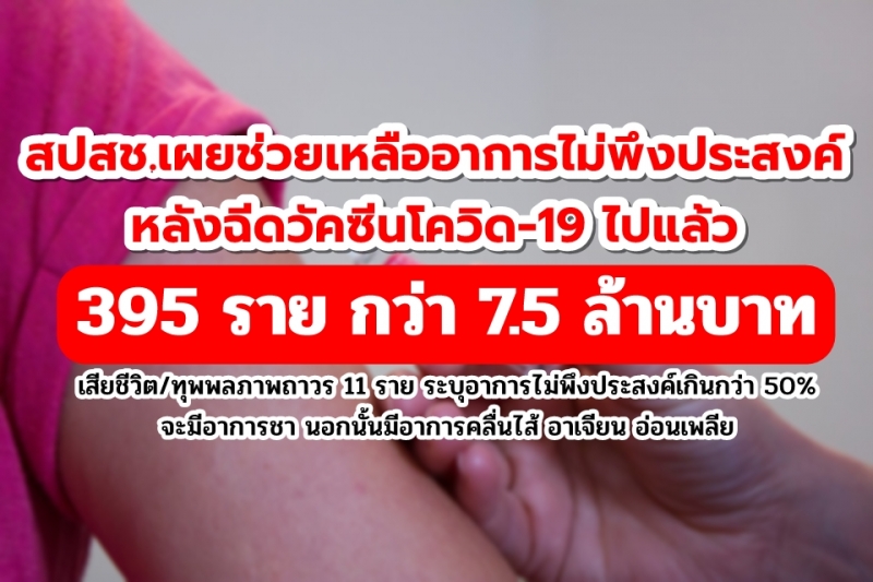 สปสช. เผย 4 สัปดาห์ จ่ายช่วยเหลือเบื้องต้นอาการไม่พึงประสงค์หลังฉีดวัคซีนโควิด-19 ไปแล้ว 395 ราย เป็นเงิน 7,572,300 บาท เป็นกรณีเสียชีวิต/ทุพพลภาพถาวร 11 ราย ระบุอาการไม่พึงประสงค์เกินกว่า 50% จะมีอาการชา นอกนั้นมีอาการคลื่นไส้ อาเจียน อ่อนเพลียจนต้องนอนพักในโรงพยาบาล ย้ำเป็นการดูแลเบื้องต้น ไม่ใช่การพิสูจน์ถูกผิดว่าเกิดจากวัคซีนหรือไม่