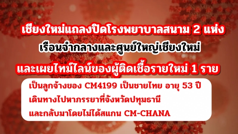 สำหรับไทม์ไลน์ของผู้ติดเชื้อรายใหม่ จำนวน 1 รายนั้น เป็นลูกจ้างของ CM4199 เป็นชายไทย อายุ 53 ปี ได้เดินทางไปหาภรรยาที่จังหวัดปทุมธานี และเดินทางกลับมายังจังหวัดเชียงใหม่ โดยไม่ได้สแกน CM-CHANA วันที่ 7 มิถุนายน ไปไซต์งานก่อสร้างย่านโรงพยาบาลกรุงเทพฯ - เชียงราย วันที่ 8 มิถุนายน ทราบผลภรรยาที่อยู่ปทุมธานีติดเชื้อโควิด 19 วันที่ 9 มิถุนายน เริ่มมีอาการ วันที่ 10 มิถุนายน เดินทางกลับมายังจังหวัดเชียงใหม่ กระทั่งวันที่ 12 มิถุนายน ทราบว่านายจ้างติดเชื้อโควิด 19 จึงได้รับการติดตามเข้ามาตรวจ ซึ่งผลการตรวจพบเชื้อเป็นโควิด 19 และจากการติดตามผู้สัมผัสทั้งหมด 3 ราย พบผลลบ 2 ราย ผลบวกอีก 1 ราย คือนายจ้าง