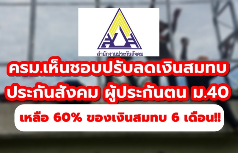 | • ครม.เห็นชอบปรับลดเงินสมทบประกันสังคม ผู้ประกันตน ม.40 เหลือ 60% ของเงินสมทบ เป็นเวลา 6 เดือน |