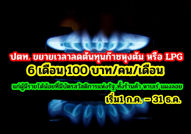 ปตท. ขยายเวลาลดต้นทุนก๊าซหุงต้ม หรือ LPG 6 เดือน 100 บาท/คน/เดือน เริ่ม1 ก.ค. – 31 ธ.ค.แก่ผู้มีรายได้น้อยที่มีบัตรสวัสดิการแห่งรัฐ ทั้งร้านค้า หาบเร่ แผงลอย