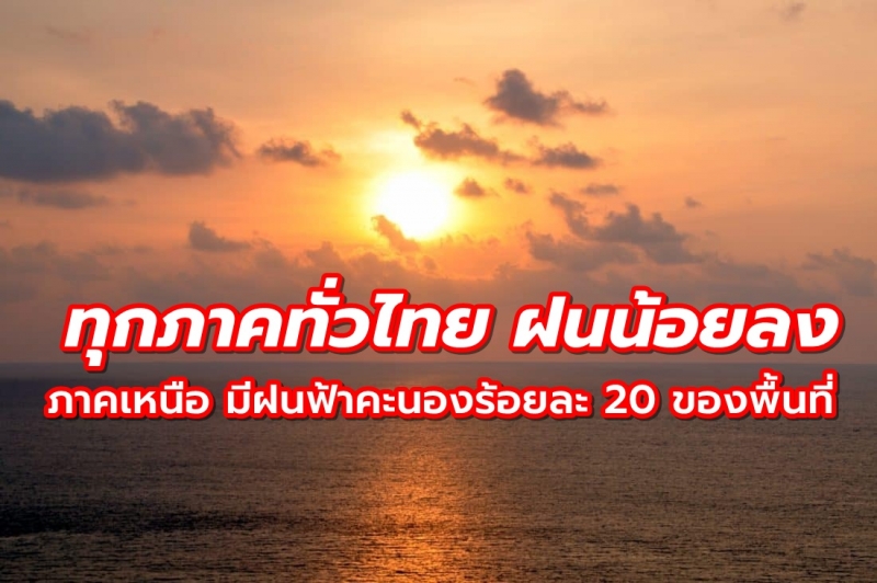 | • ทุกภาคทั่วไทย ฝนน้อยลง ภาคเหนือ มีฝนฟ้าคะนองร้อยละ 20 ของพื้นที่ |