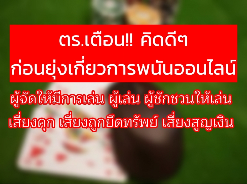 ตร.เตือนคิดให้ดีก่อนจะเกี่ยวข้องกับเว็บไซต์พนันออนไลน์ ทั้งผู้จัดให้มีการเล่น ผู้เล่น ผู้ชักชวนให้เล่น เสี่ยงคุก เสี่ยงถูกยึดทรัพย์ เสี่ยงสูญเงิน