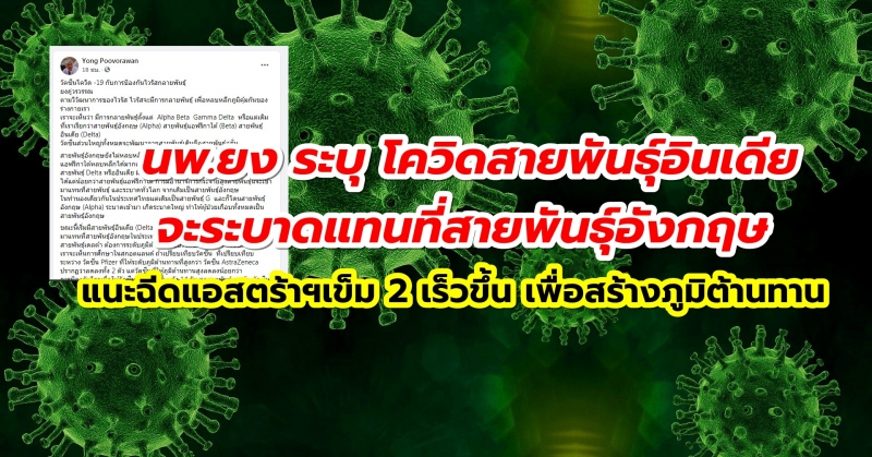 นพ.ยง ระบุ โควิดสายพันธุ์อินเดียจะระบาดแทนที่สายพันธุ์อังกฤษ แนะฉีดแอสตร้าฯเข็ม 2 เร็วขึ้น เพื่อสร้างภูมิต้านทาน